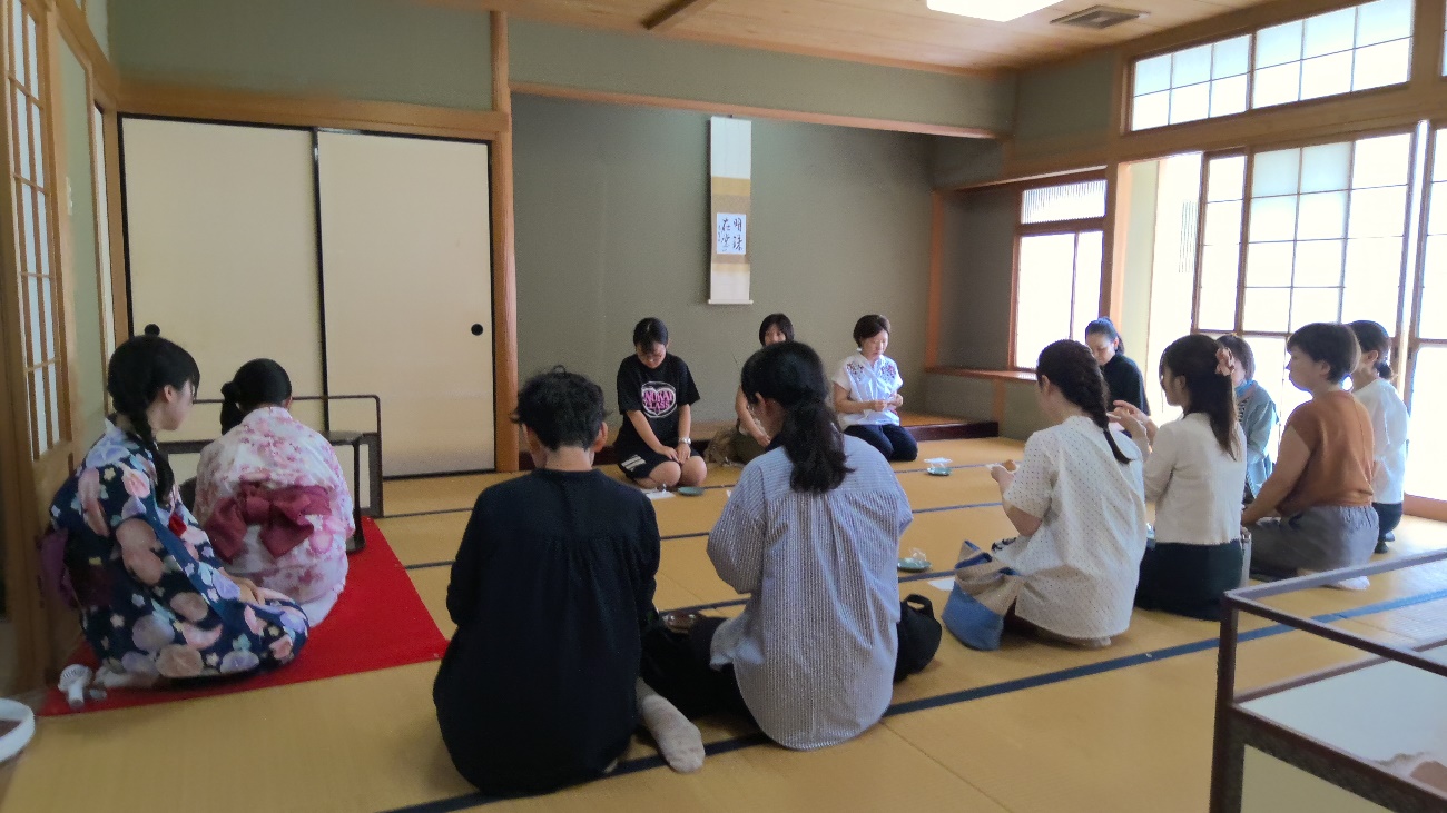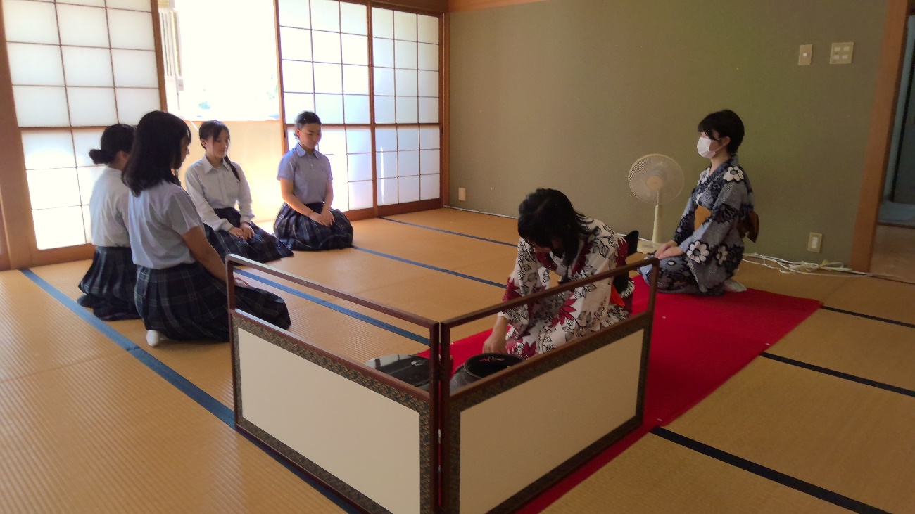 「和敬静寂」の心得を大切に、現在1年生6名、2年生10名で活動しています。週3回の活動のうち、1回は講師の先生にご指導いただいています。初心者から始める生徒がほとんどですが、文化祭でのお茶会や1月の睦月茶会の開催、表千家同門会主催のふれあい茶会への参加、またお免状の取得など、年間を通して目標をもってお稽古に励んでいます。